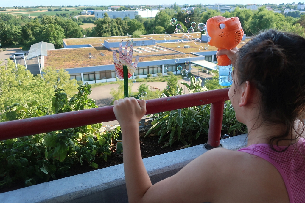 An den heißen Tagen haben wir, Gruppe 48, uns auf dem Balkon eine kleine Abkühlung verschafft. Es gab einen „Pool“, in den wir unsere Füße strecken konnten, Wasserspaß mit Spritzpistolen, Musik und schöne Seifenblasen.