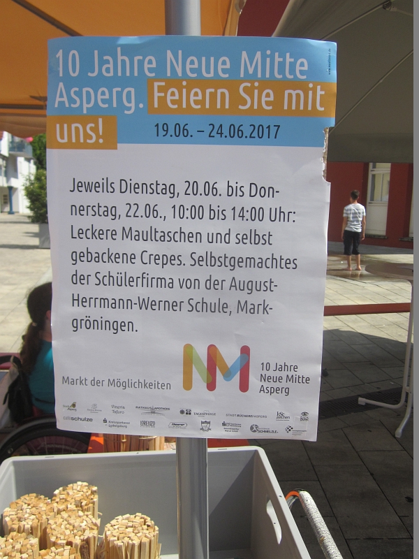 Von Dienstag, 20. Juni bis Donnerstag, 22. Juni 2017 war unsere Schülerfirma AHWerk der August-Hermann-Werner Schule auf dem Fest zum 10jährigen Bestehen der „Neuen Mitte“ in Asperg vertreten.