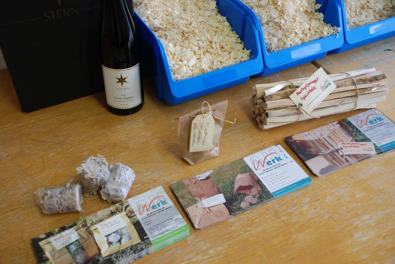 Hochmotiviert und mit viel Arbeitseinsatz arbeiteten die Schülerinnen und Schüler diesen Auftrag ab. Es wurden Kartons gefaltet und unsere Produkte (Spächtele, Grillanzünder, Samenbomben) einsortiert. Hinzu kam noch eine Flasche Wein, die vorsichtig auf die Hobelspäne gelegt wurde.