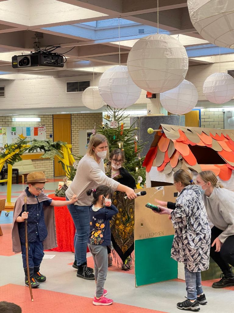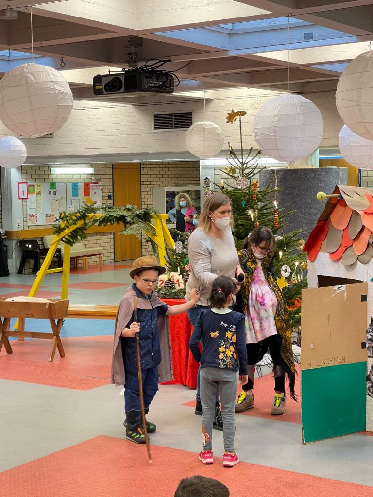 In unserem Gottesdienst war Josef gar nicht mit dem Platz im Stall einverstanden. Er wollte unbedingt ins Haus und ließ sich auch nicht von Maria überzeugen, dass der Platz im warmen Stalle doch auch gut sei. Leider gibt es kein Foto vom Stall, wo Maria dann ganz allein mit ihrem Kind vor der Krippe sitzt und sich wundert, dass Josef sie nicht unterstützt – das war die besondere Weihnachtsgeschichte 2021, die doch manchen von den erwachsenen Zuschauern und Zuschauerinnen zum Schmunzeln gebracht hat.