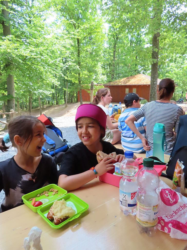 „Wie wir zurückgekommen sind, haben wir Pause gemacht. Ich bin da rein in die Matte. Frau Merz hat gegrillt. Ich hab Salat gegessen, Wurst und Grillfackel. Wir waren dann noch Schwimmen. Ich hab mit den Enten gespielt. Ich hab neben dem Rohat geschlafen. Auf der anderen Seite war Frau Reck. Ich hab gut geschlafen. Wir haben gefrühstückt: Brötchen mit Nutella und ein Spiegelei und Muffin und Müsli und Kaba.“