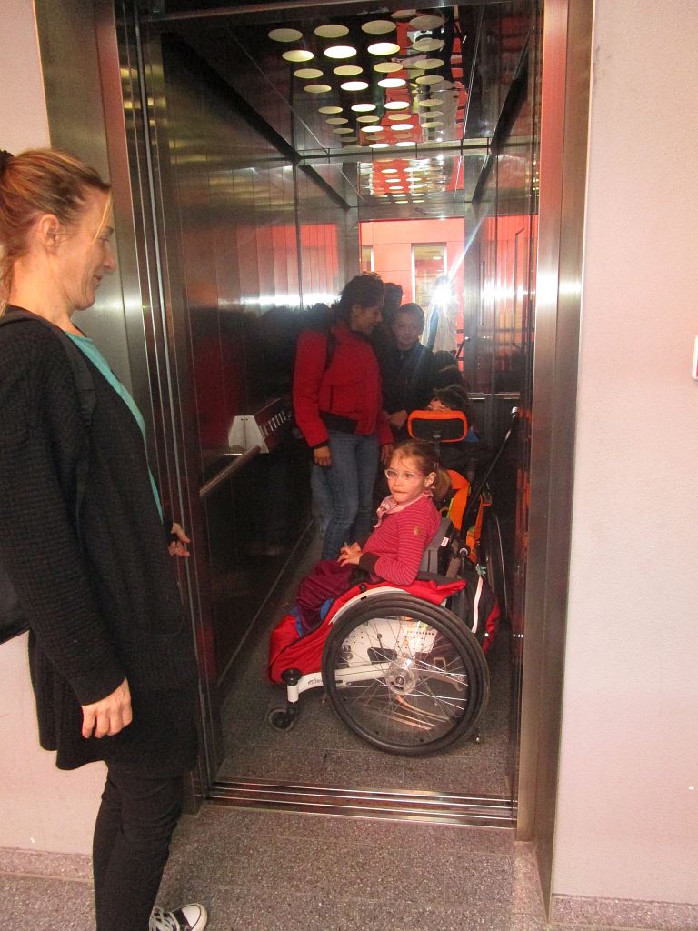 Wir sind angekommen und mussten ein bisschen noch laufen und dann sind wir mit dem Aufzug hochgefahren.