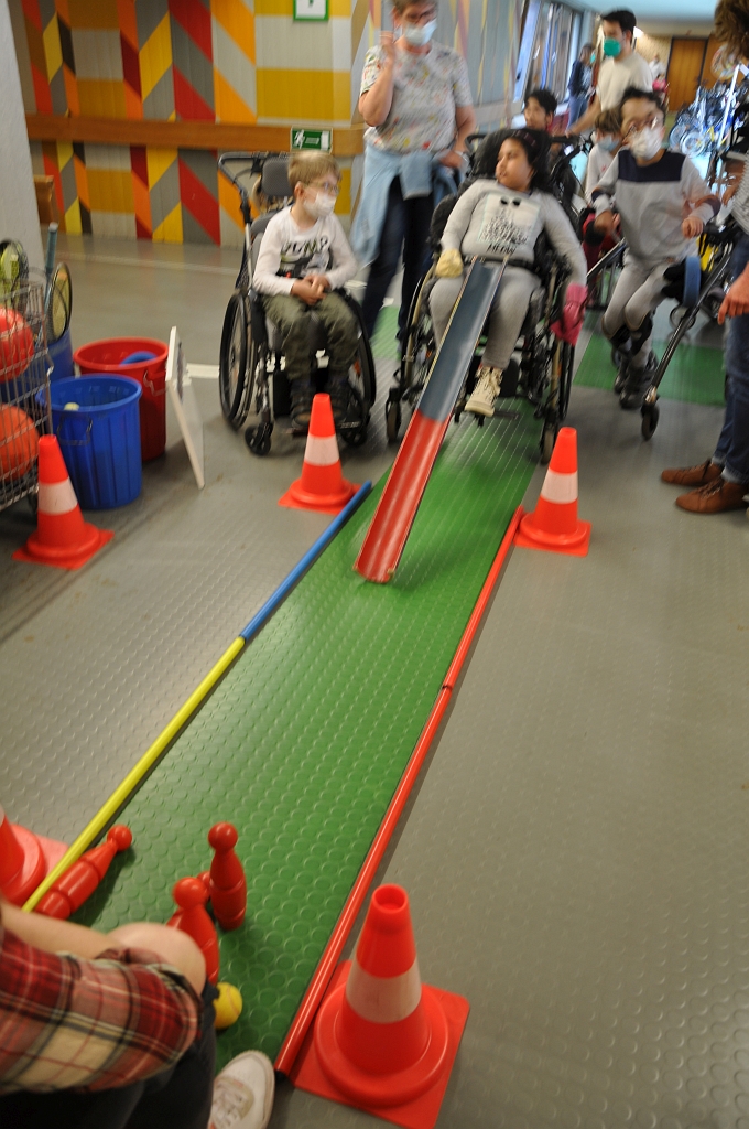 Die Röhre muss positioniert, der Ball ergriffen, festgehalten und losgelassen werden. Anschließend zählt jede/r die umgefallenen Kegel. Eine/r notiert mit Würfelbildern oder Ziffern das Ergebnis. Die Tätigkeiten machen die Schüler und Schülerinnen so selbstständig wie möglich und erhalten notwendige Hilfestellungen.