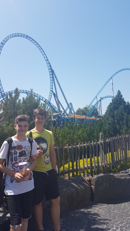 Anschließend holten wir unser Lunchpaket ab und aßen etwas, danach fuhren wir Wasserbahnen in Griechenland. Außerdem fuhren wir noch Achterbahnen in anderen Ländern wie die Holzachterbahn, Blue Fire, Tiroler Wildwasserbahn, kleine Achterbahn, Arthur Bahn und Kettenkarussell. Die Wartezeiten waren relativ kurz.