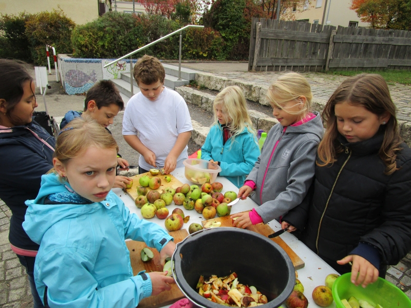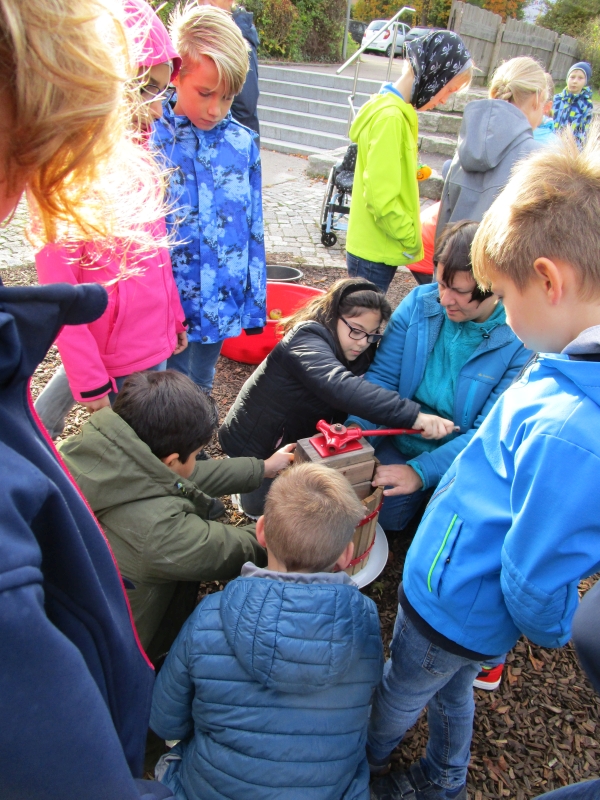 Insektenhotels für Wildbienen wurden gebaut, Tiere auf der Wiese bestimmt, Saft aus Äpfeln der Streuobstwiese gepresst und eine Apfelprobe durchgeführt.
