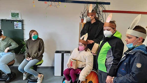 Die Klasse 5c hat mit Unterstützung der Klasse 6/7 im Kunstunterricht Osterkarten und Osternester für jede Klasse, Kindergarten, Schulleitung und Verwaltung gebastelt. Der Förderverein hat die Süßigkeiten finanziert.
