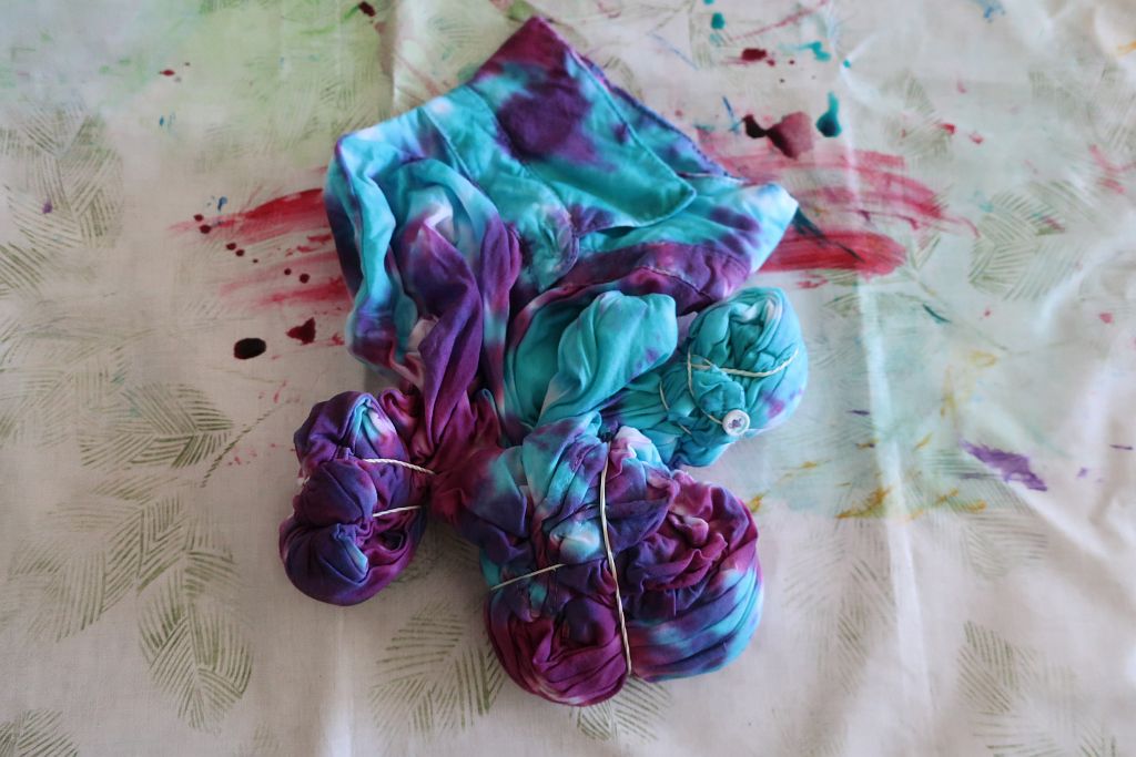 Batik ist eine besondere Art und Weise, Stoff zu färben. Entweder wird der Stoff in einen Farbeimer getunkt, oder er wird mit Farbe beträufelt (so haben wir unsere T-Shirts gefärbt). Vorher ist es wichtig, den Stoff zu verknuddeln, damit es tolle Muster gibt.