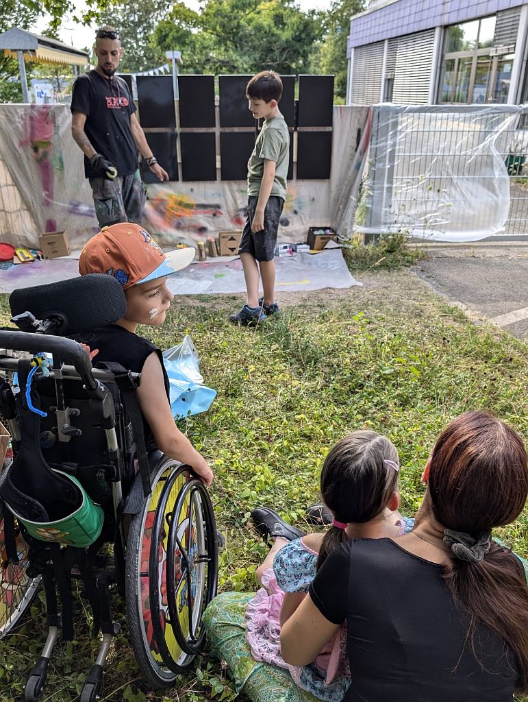 Die Überraschung der Eltern war ein Graffitikünstler. Alle zusammen konnten unter seiner Anleitung ein wunderschönes Graffiti sprühen. Groß und klein wurden sehr kreativ und hatten viel Spaß beim Sprayen.